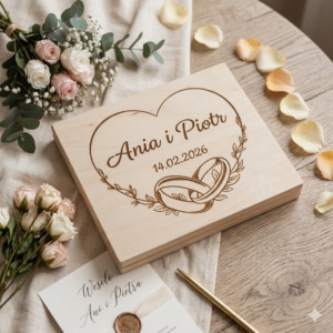Drewniana skrzynka z grawerem 21,5×17,8×2,8 cm z naturalnej sosny to elegancki pomysł na prezent i praktyczne pudełko na pamiątki oraz domowe skarby. Dzięki trwałemu grawerowi laserowemu możesz w pełni spersonalizować wieko – wybierając gotowy wzór (np. U1, S5) lub konfigurując projekt z ramką (R1…) i czcionką (C1…), a także dodając imiona, datę, dedykację czy własną grafikę.